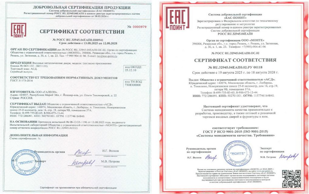 Входная дверь — это лицо вашего дома. Она обязана быть надежной, сохранять тепло, защищать от шума и при этом радовать глаз. Закон не требует обязательной сертификации, но в АСД мы пошли дальше. Мы понимаем: когда качество подтверждено документально, клиент получает уверенность в своем выборе. Добровольная сертификация всех наших моделей — это гарантия надежности, честности и безопасности. Двери АСД не просто красивые — они проверены и подтверждены официально.