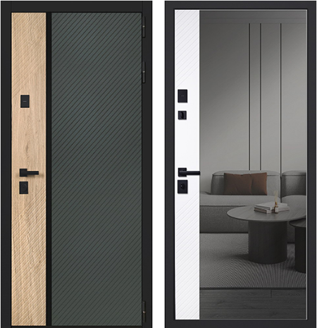 Снаружи «Эдинбург» поражает сочетанием панелей МДФ «силк олива» и «дуб галиф натур», объемной фрезеровкой и вставкой из черного лакобеля. Внутри — белая матовая панель с большим зеркалом, которое делает интерьер просторнее. Фурнитура выдержана в черном цвете, порог выполнен из нержавейки «хром». В итоге дверь смотрится как элемент интерьера, а не просто вход.