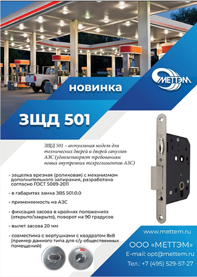 ЗЩД 501 – актуальная модель для технических дверей и дверей санузлов АЗС (удовлетворяет требованиям новых внутренних техрегламентов АЗС). Защелка разработана согласно ГОСТ 5089-2011 в габаритах замка ЗВ5 501.0.0 (100% совместимость по габаритно-присоединительным размерам).